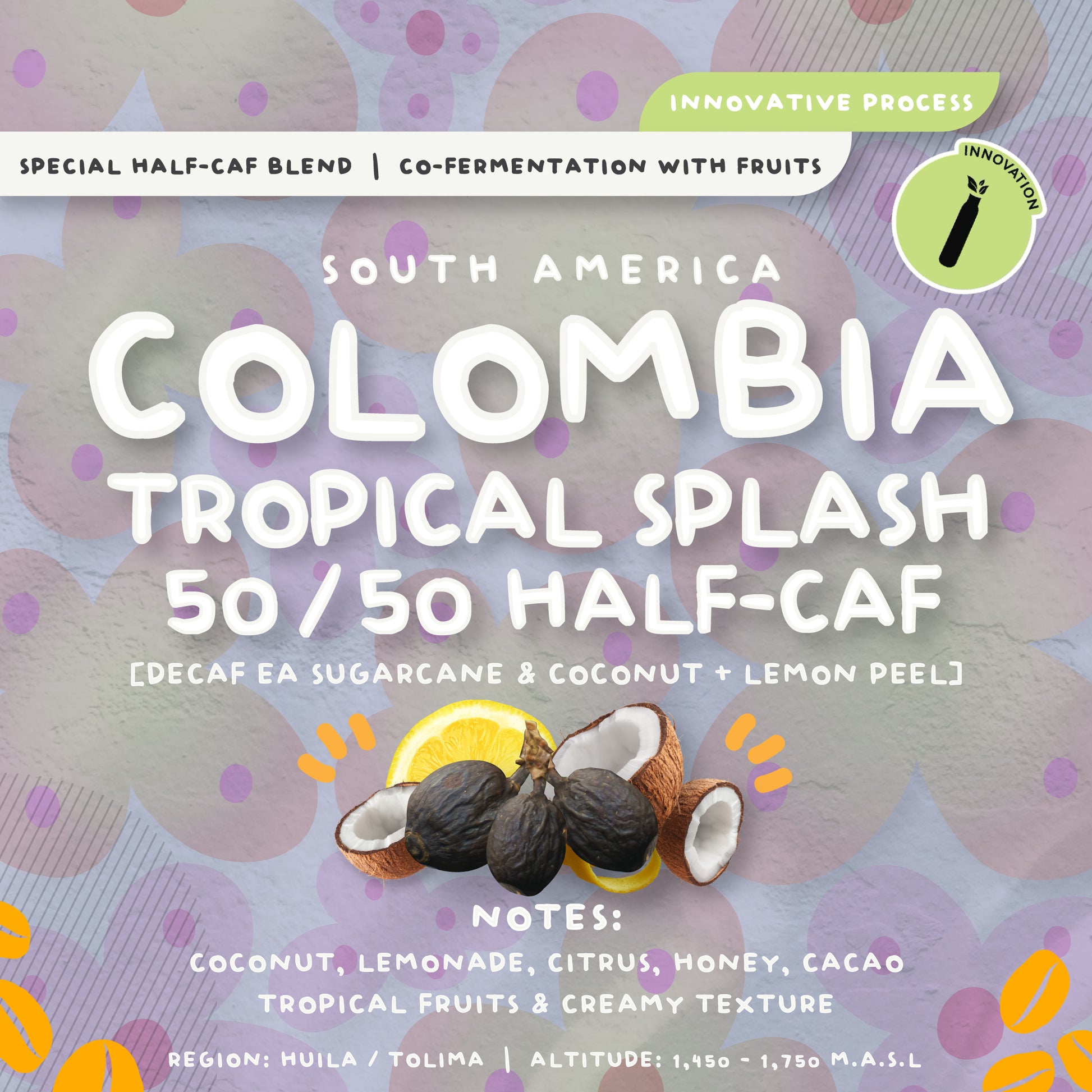 Our signature half-caffeinated coffee crafted for full flavor with less caffeine. This blend combines 50% Colombia El Vergel Natural EA Sugarcane Decaf with 50% rotating fruit co-fermented coffees, delivering expressive aromatics, layered sweetness, and a smooth, balanced finish, perfect from morning to night.