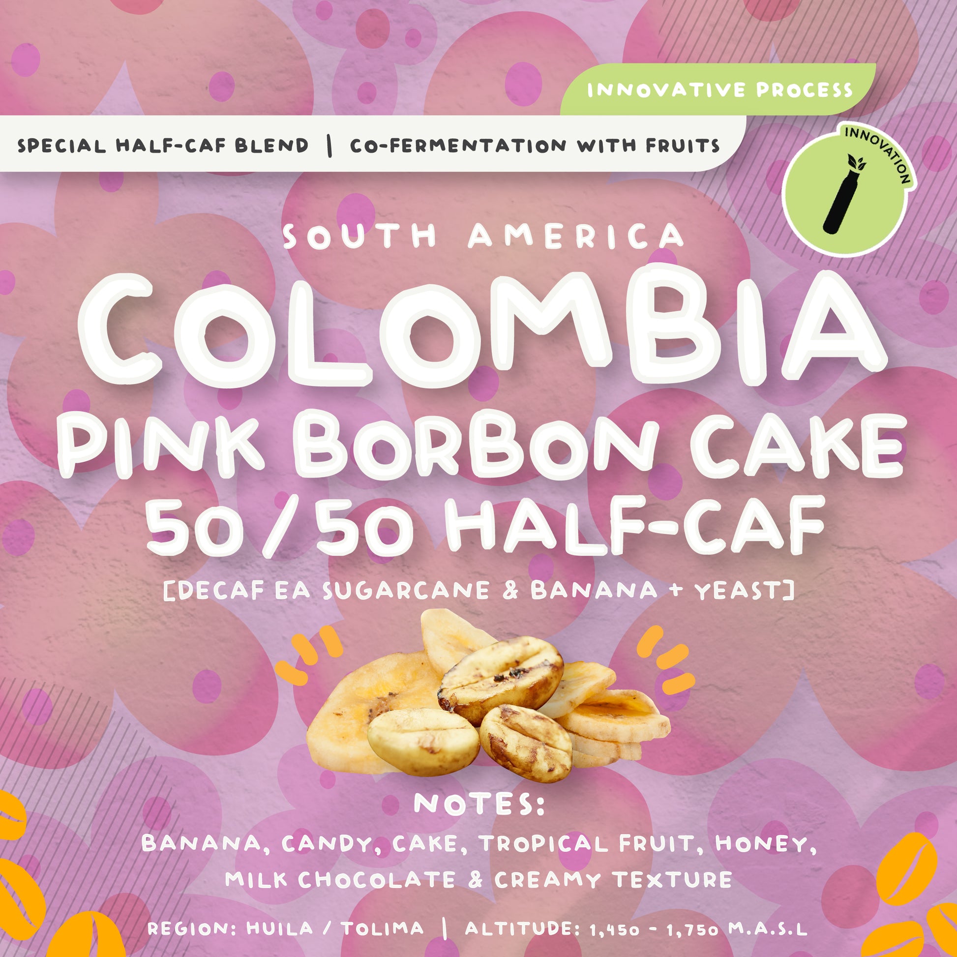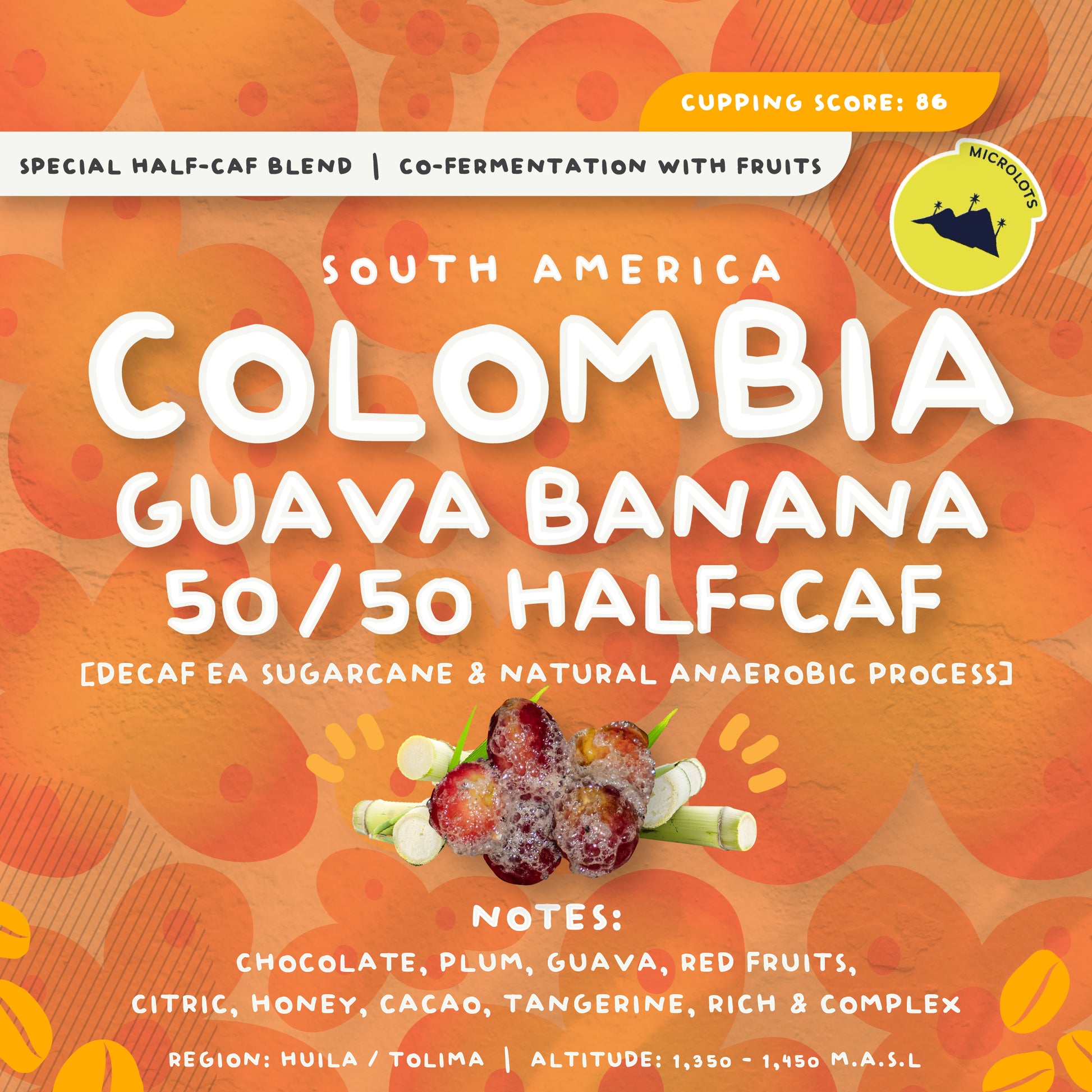 Available as three fruit co-fermented 50/50 half-caf blends, a regular 50/50 Guava Banana (natural anaerobic fermentation), and a full Decaf Natural EA sugarcane.