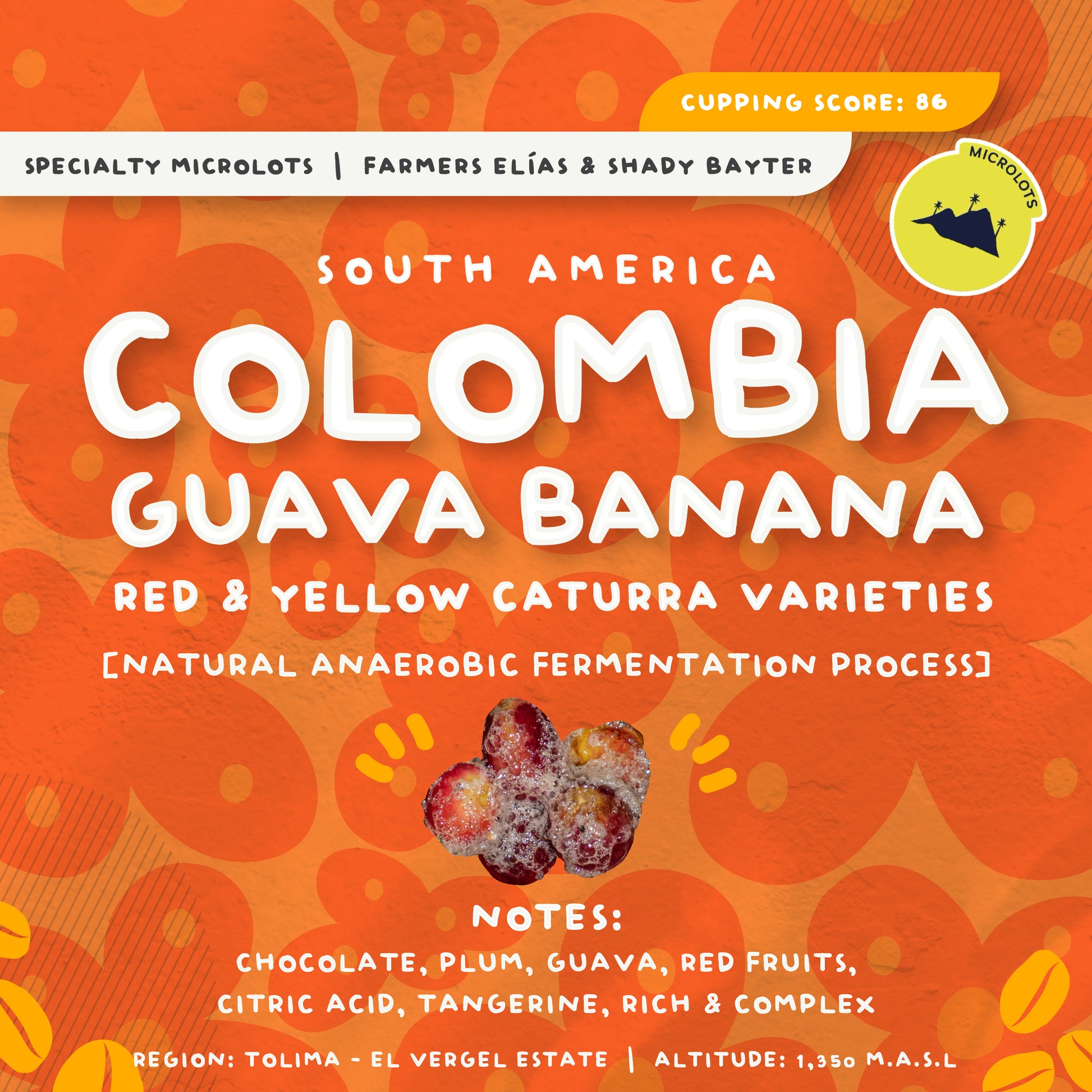 Guava Banana —— 來自 Tolima Fresno 著名 El Vergel 庄園 的充滿活力與表現力的微批次咖啡,由農夫 Elías 與 Shady Bayter 精心打造,展現現代厭氧發酵的精準與創意。預期享受一杯多層次的熱帶甜感咖啡,酸質明亮、果香深邃。